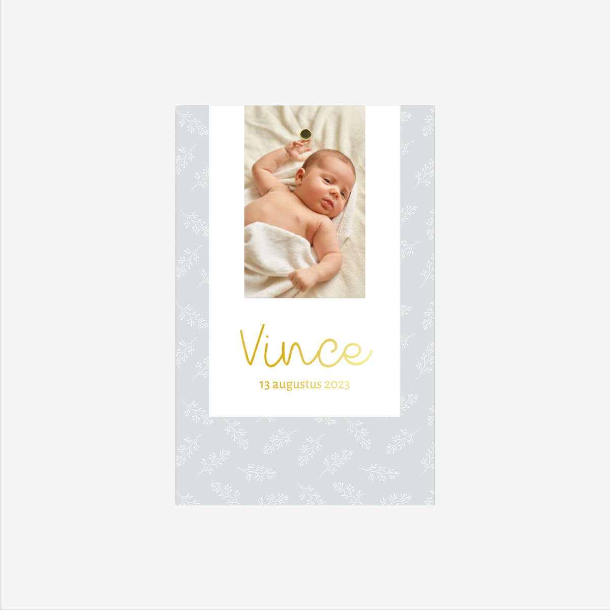 Vrolijk geboortekaartje met fotolabel, blauw achtergrond met takjes print en goudfolie. Het formaat van de onderste kaart is 11 x 17 cm. De drie kaartjes kunnen aan elkaar vastgemaakt worden met een splitpen of een leuk touwtje/lintje.