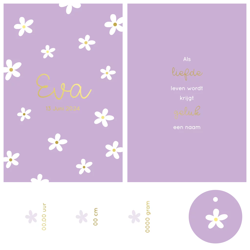 Ga voor iets echt bijzonders met dit elegante paarse Pocketfold geboortekaartje, versierd met delicate bloemetjes en sprankelend goudfolie. Plaats de verschillende kaartjes gemakkelijk in het pocketfold mapje en sluit het stijlvol af met een leuk touwtje, lintje of koord, afgewerkt met een rond labeltje voor een charmante look.