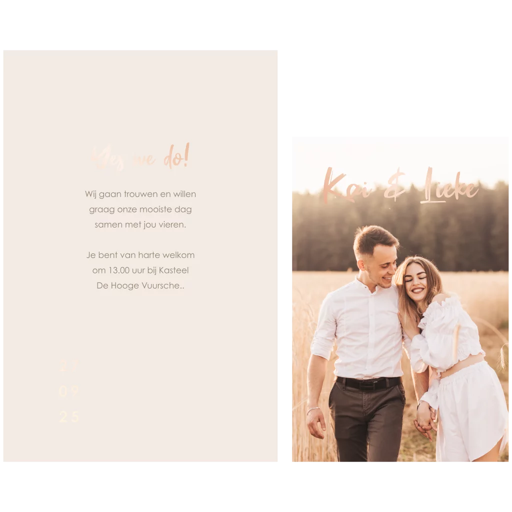 Maak jullie trouwdag onvergetelijk met deze persoonlijke trouwkaart. Het herfstige ontwerp met de insteekkaart en rosegoudfolie zorgt voor een warme en unieke uitstraling. Voeg jullie eigen tekst en foto's toe en deel jullie liefde met jullie gasten.