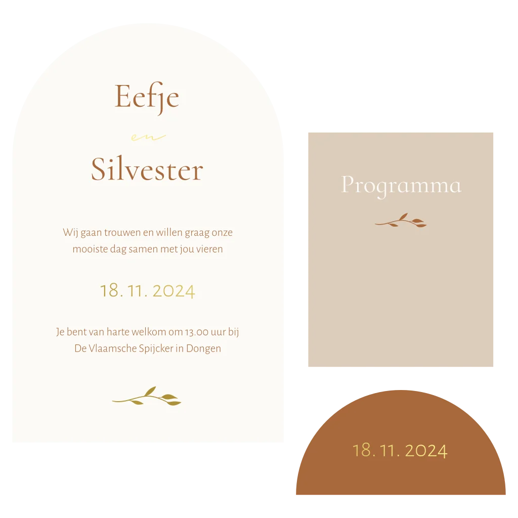 Ben je op zoek naar een unieke en trendy trouwkaart? Deze prachtige trouwkaart stapelset in boho chic stijl is perfect voor moderne bruidsparen. Het ontwerp met de boogvormige details en zachte kleuren geeft een speelse en elegante touch aan jullie trouwkaart. De set bestaat uit meerdere kaartjes die op elkaar gestapeld worden, waardoor je alle belangrijke informatie op een overzichtelijke en stijlvolle manier kunt presenteren.