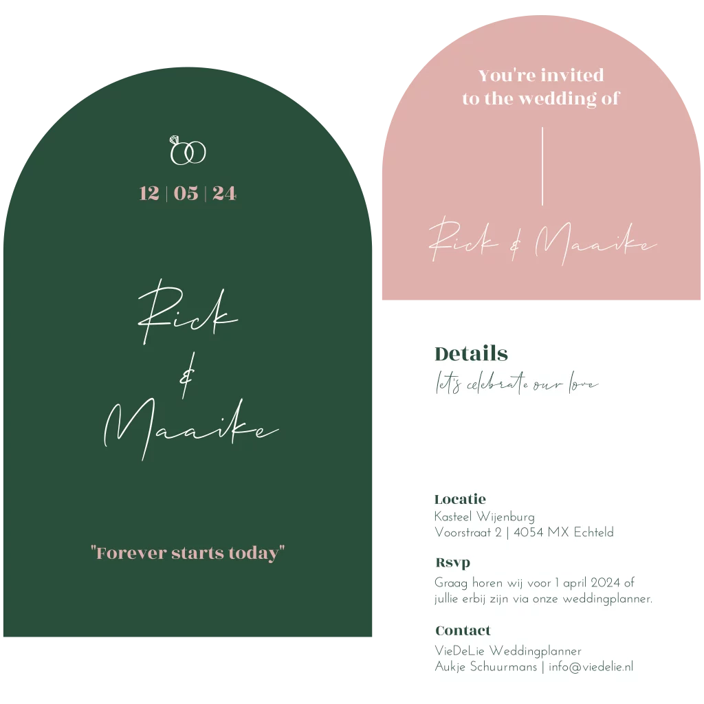 Maak jullie trouwdag onvergetelijk met deze persoonlijke trouwkaart. Het speelse ontwerp met de boogvormige stapelset in de kleuren groen, wit en roze zorgt voor een vrolijke en unieke uitstraling. Voeg jullie eigen tekst en details toe en deel jullie liefde met jullie gasten.