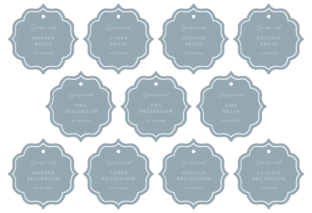 Laat jullie gasten weten waar ze mogen zitten tijdens jullie huwelijksceremonie met deze gepersonaliseerde naamkaartjes of zitplaatskaartjes. In prachtig unieke en bijzondere pastel blauwe vorm. De sierlijke namen maken het extra persoonlijk, terwijl je de kleuren en het lettertype eenvoudig zelf kunt aanpassen. Bevestig de naamkaartjes gemakkelijk aan de stoelen met een leuk lintje. Formaat 10 x 10 cm, incl boorgaatje.