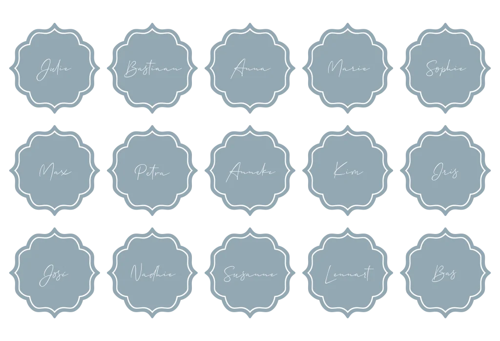 Geef je tafelstyling een speelse en perosoonlijke touch met deze unieke naamkaartjes in een bijzondere pastel blauwe vorm. De sierlijke namen maken het extra persoonlijk, terwijl je de kleuren en het lettertype eenvoudig zelf kunt aanpassen. Bevestig de naamkaartjes gemakkelijk aan de bijpassende menukaarten met een leuke, bijpassende paperclip voor een perfect geheel. Bekijk ook de bijpassende menukaart.