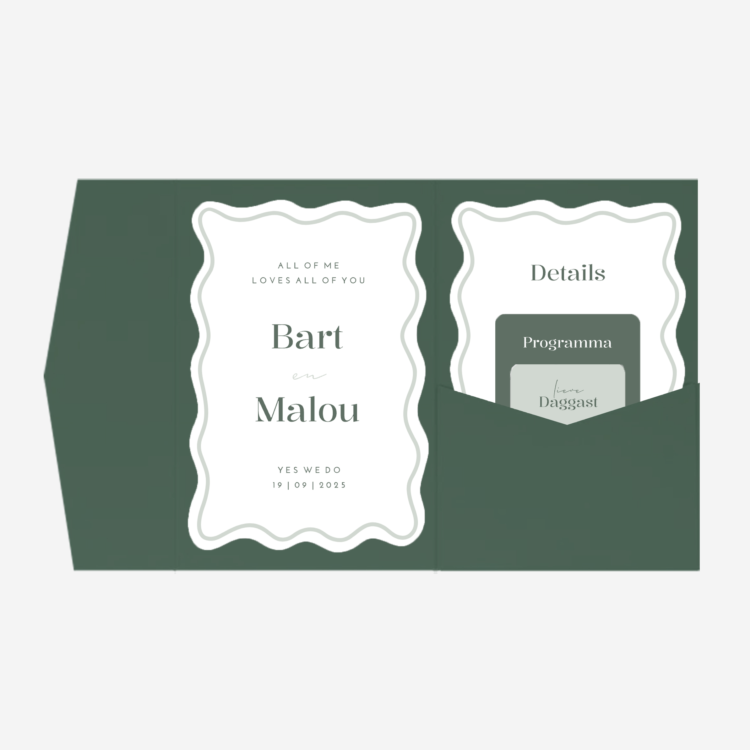 Prachtige pocketfold trouwkaart met trendy groentinten en golf vorm insteekkaarten. De trouwkaart is niet alleen mooi, maar ook heel praktisch. Het luxe pocketfold mapje zorgt ervoor dat alle informatie over jullie bruiloft overzichtelijk kan worden weergegeven, inclusief handig dagprogramma. Daarnaast kunnen jullie extra items toevoegen, zoals een bijpassende RSVP-kaartje en ruimte voor informatie van de weddingplanner of ceremoniemeester. Liever andere kleuren of een ander lettertype? Geen probleem dit pas je gemakkelijk zelf aan.