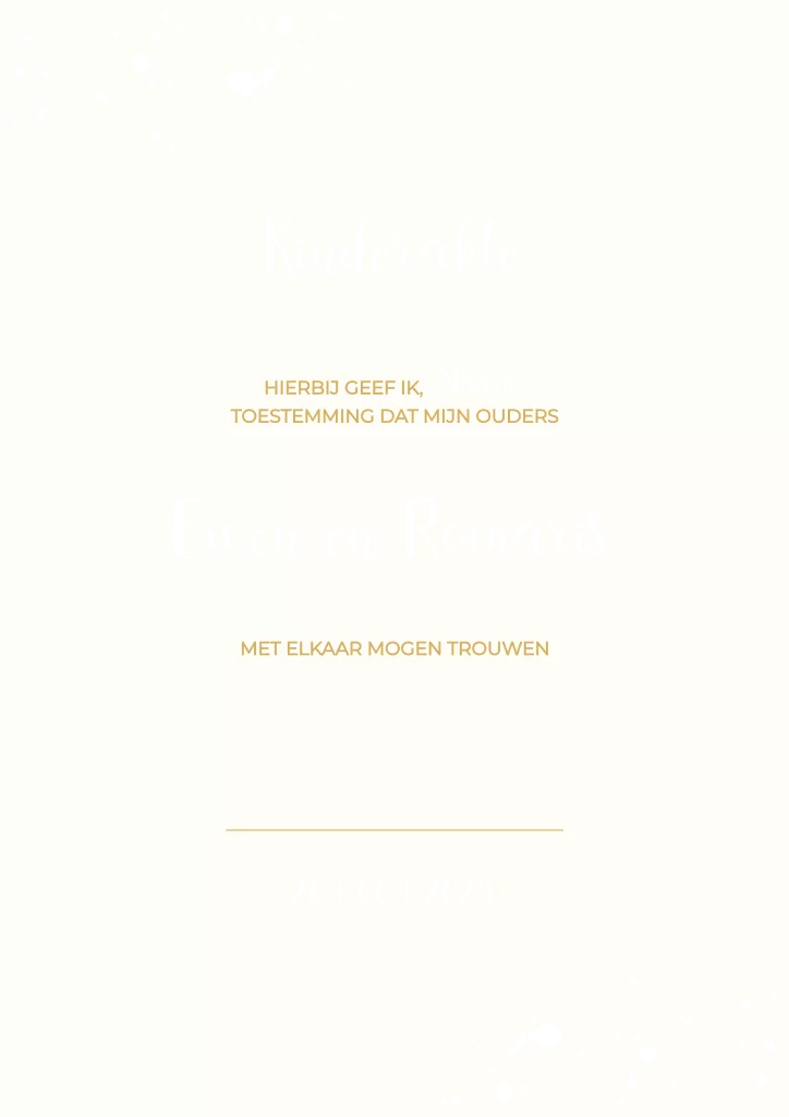 peciaal voor jullie kinderen: een eigen kinderakte in dezelfde stijl als jullie trouwkaart. Laat ze hun handtekening zetten of gebruik de ruimte voor een vingerafdruk als ze nog te klein zijn. De kleuren en lettertypes zijn eenvoudig aan te passen in de editor, zodat het perfect aansluit bij jullie trouwhuisstijl. Een liefdevol en persoonlijk detail voor jullie bruiloft.