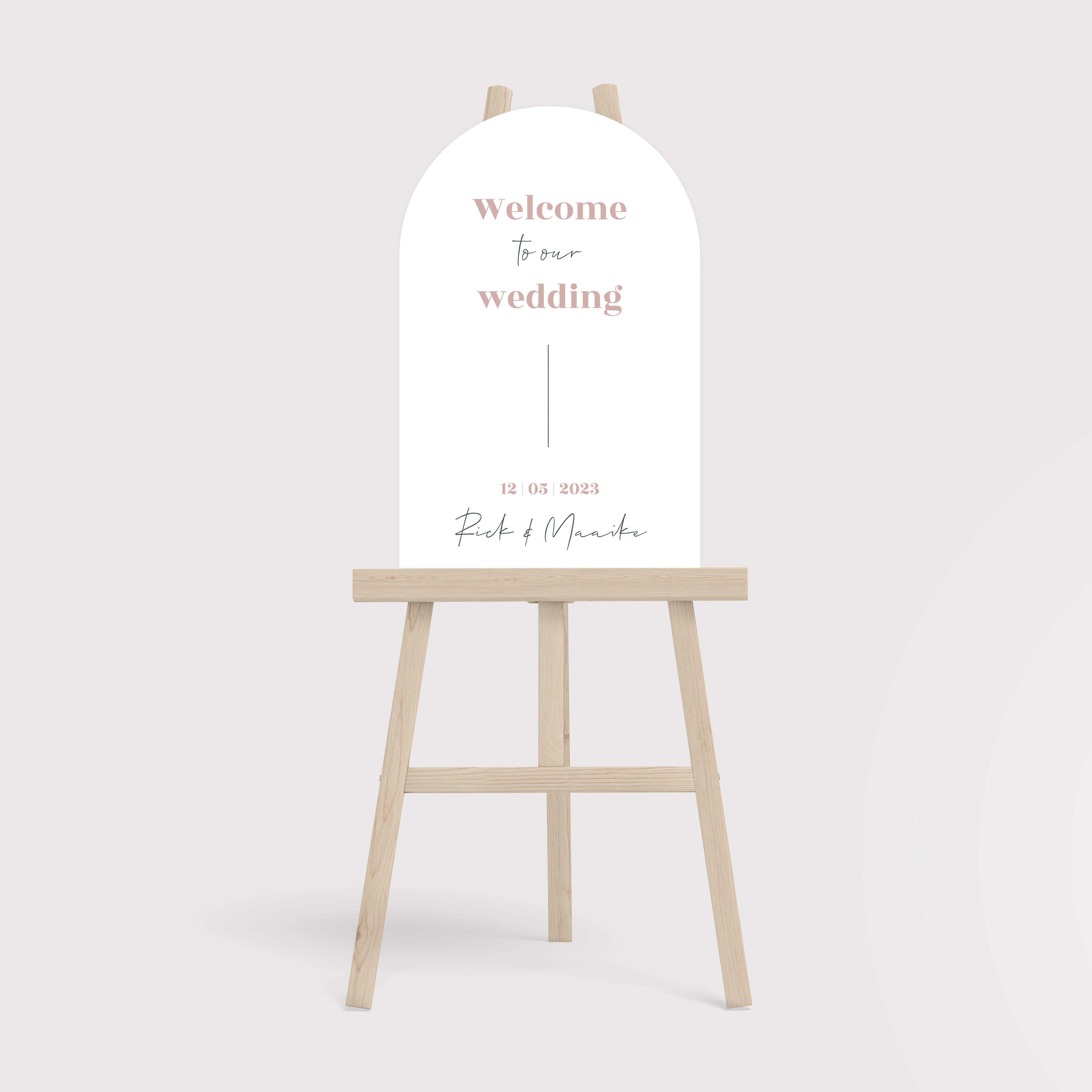 Ga voor alles in 1 stijl met dit mooie boogvorm welkomstbord voor op jullie bruiloft. Bekijk de complete trouwhuisstijl met bijpassende save the date, trouwkaart en meer.