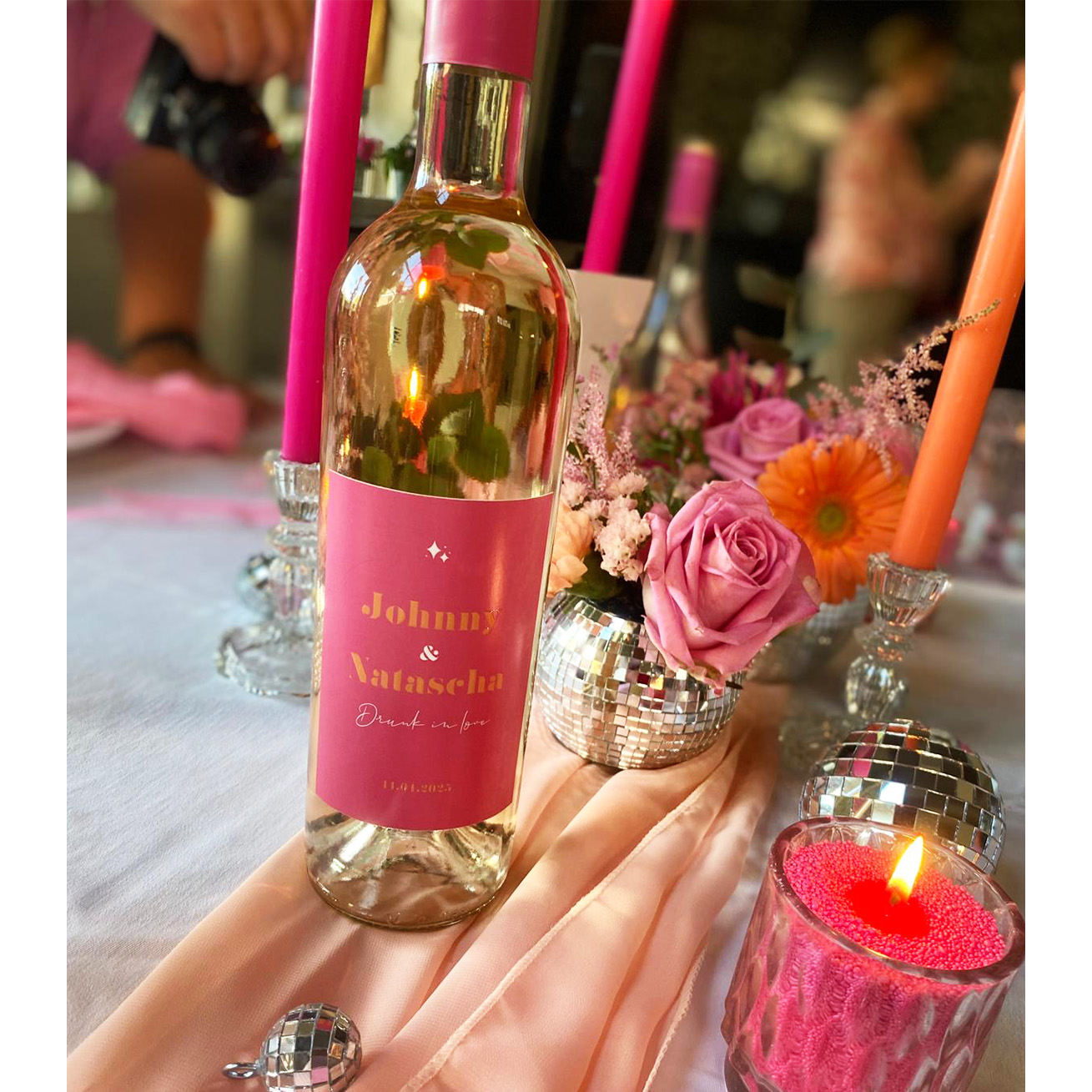 Geef jullie huwelijksfeest of speciale gelegenheid een glamoureuze 'Disco Chique' look! Dit gepersonaliseerde wijnetiket heeft een levendige roze basis met namen en datum in een roze-oranje metallic-glans. De hoogglans afwerking zorgt voor een extra luxe uitstraling. Eenvoudig aan te brengen en geleverd in sets van 5 stuks. Ontwerp in de online editor naar eigen wens!