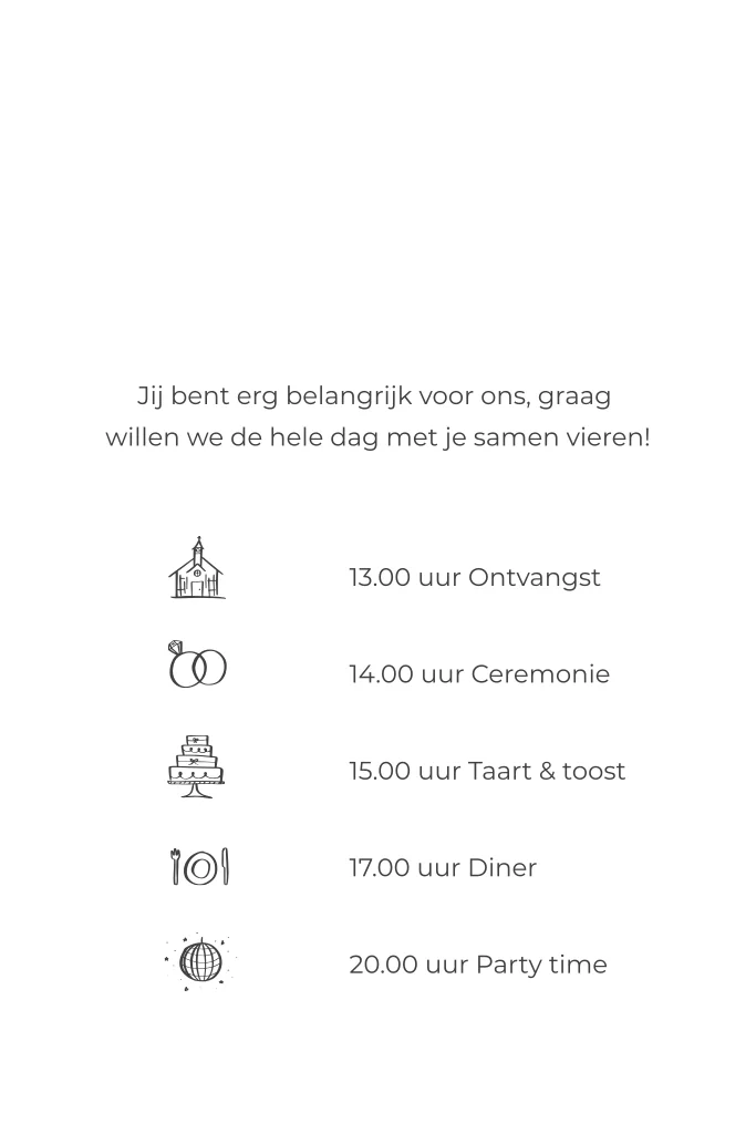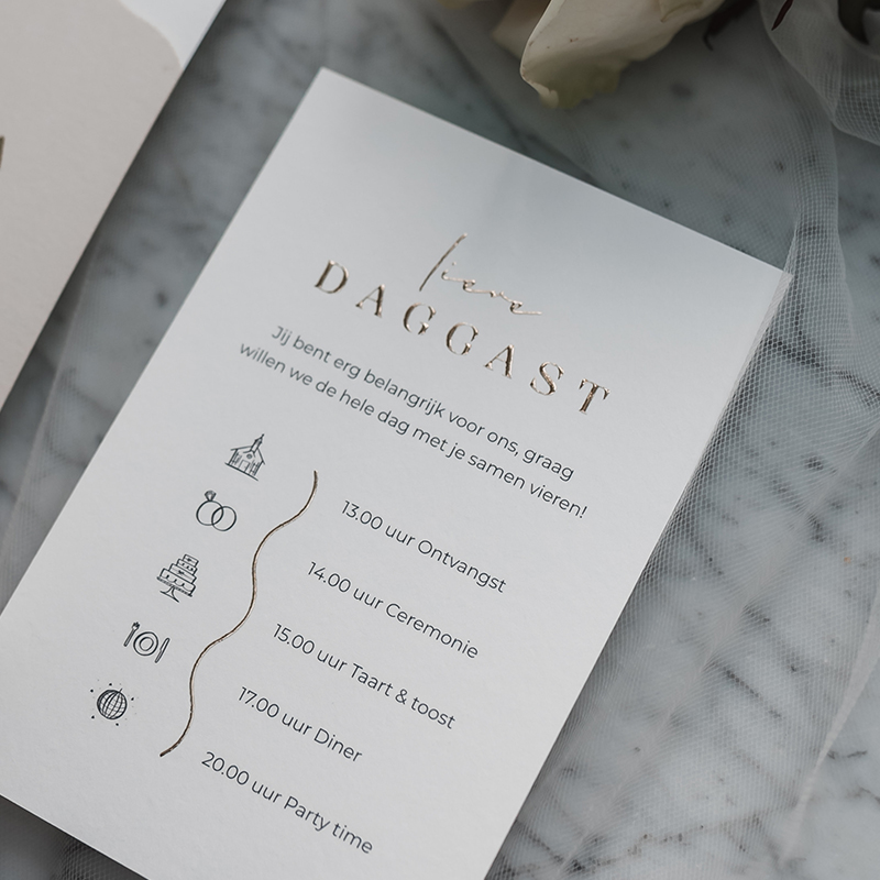 Creëer je eigen luxe trouwdagprogramma in onze editor. Perfect voor een onvergetelijke huwelijksdag.
