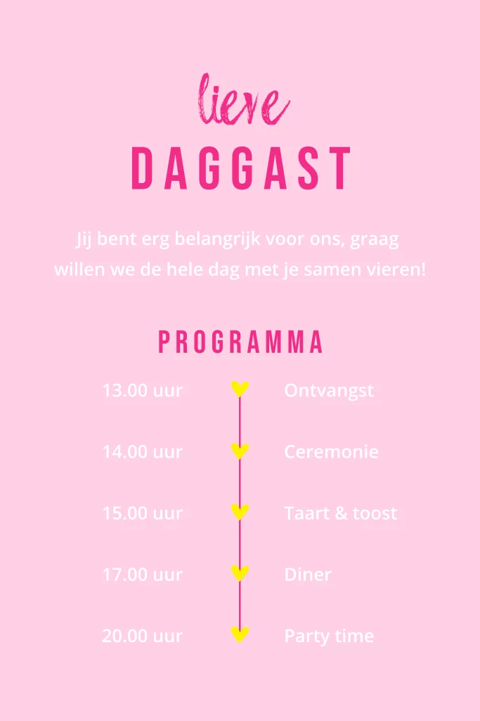 Geef je gasten een duidelijk overzicht van de dag met deze stijlvolle dagprogramma kaart in zomers neon roze en geel. Het ontwerp past perfect bij een bruiloft met een vrolijke en moderne sfeer. Personaliseer de kaart met jullie eigen programma en laat je gasten weten wat ze kunnen verwachten.