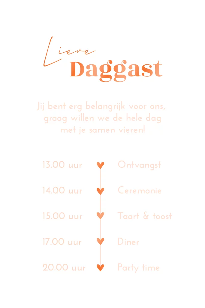 Dit bijpassende dagprogramma is ontworpen in dezelfde zomerse oranje stijl met hoogglans afwerking als de trouwkaart. Een stijlvolle en overzichtelijke manier om jullie gasten te informeren over het verloop van de dag. Perfect te combineren met de bijpassende save the date, het welkomstbord, de menukaarten en naamkaartjes. Zo creëren jullie een complete en kleurrijke trouwhuisstijl die tot in detail klopt. Personaliseer eenvoudig in onze editor.