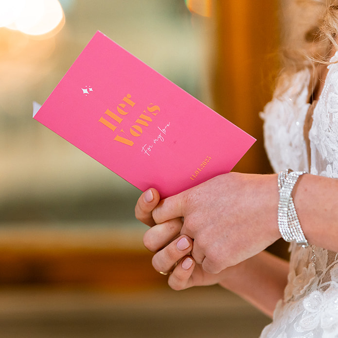 Stijlvol felroze geloftenboekje met een glamoureuze 'Disco Chique' uitstraling. Perfect voor de moderne bruid om haar geloften in te bewaren. Met de tekst "Her Vows" en blanco pagina van hoogwaardig papier. Een prachtig aandenken aan de huwelijksdag.