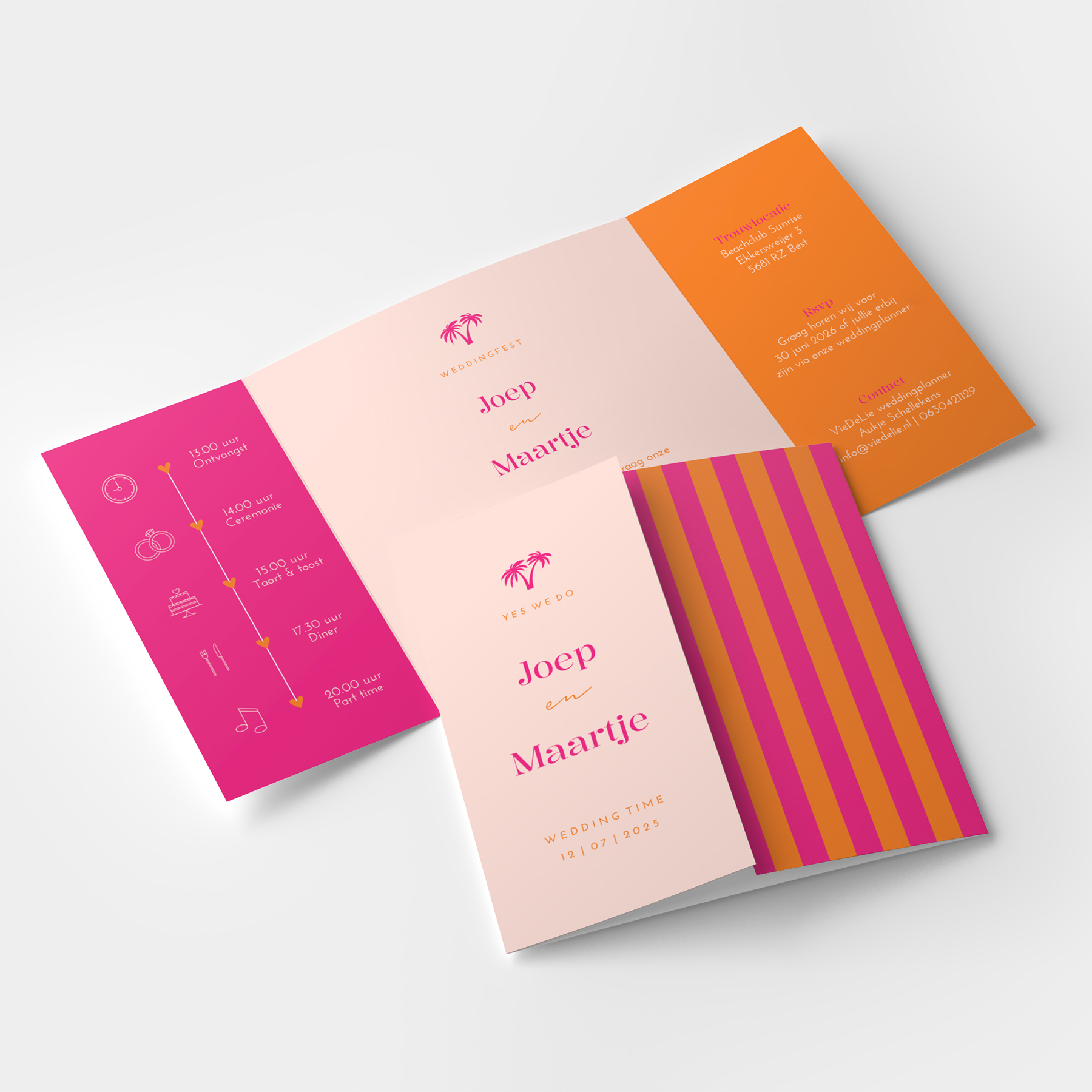 Theatervouw trouwkaart vierkant met trendy felle kleuren. Het unieke palmboom ontwerp in roze, oranje en peach is speciaal ontworpen voor bruisparen die durven de kiezen voor kleur! Het design geeft de kaart een tropische en feestelijke touch.