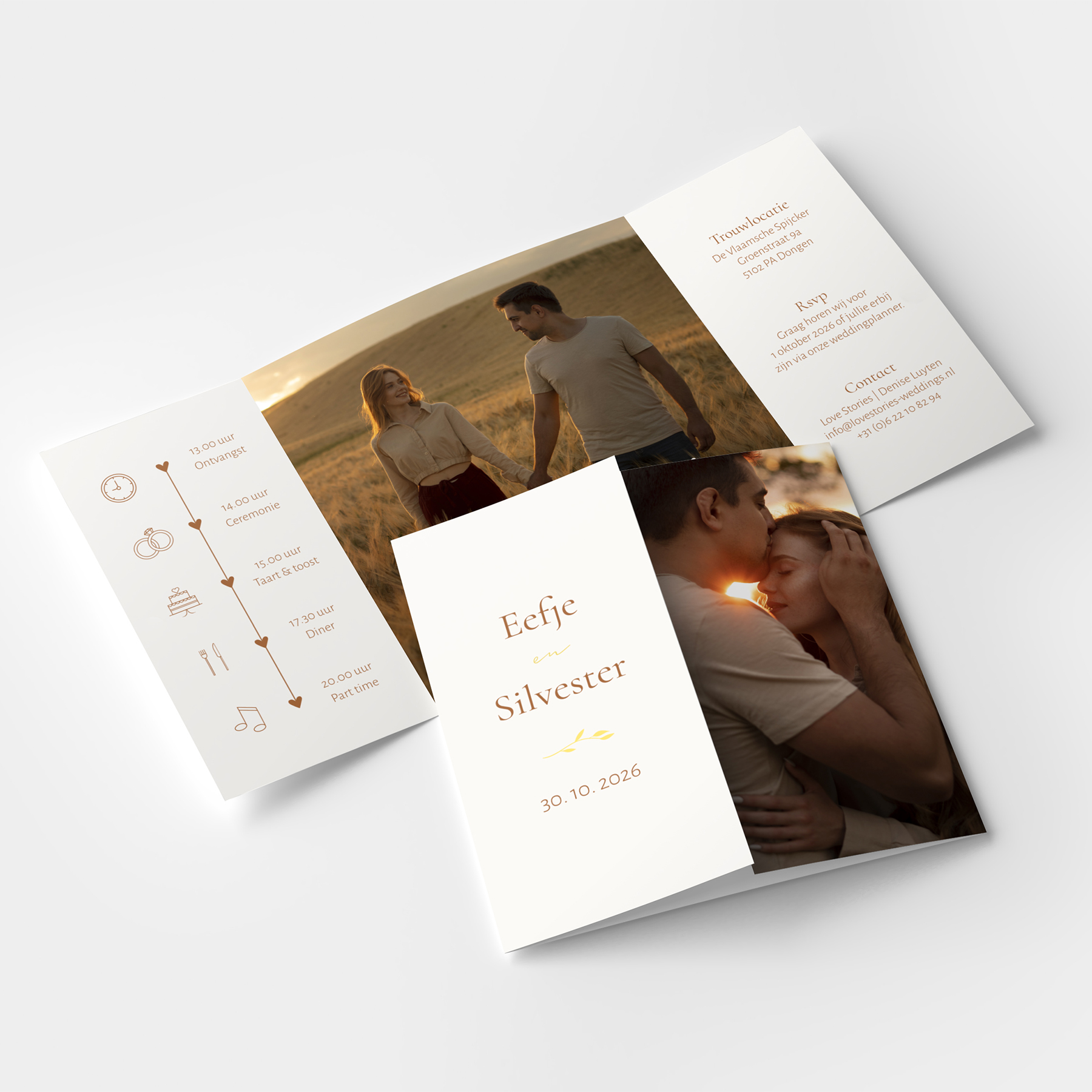 Uitnodiging boho chic bruiloft met foto en goudfolie. De foto's zijn gemakkelijk zelf aan te passen net als de teksten, kleuren, lettertypes. Sluit de kaart met een mooi chiffon lint of touwtje uit onze collectie.