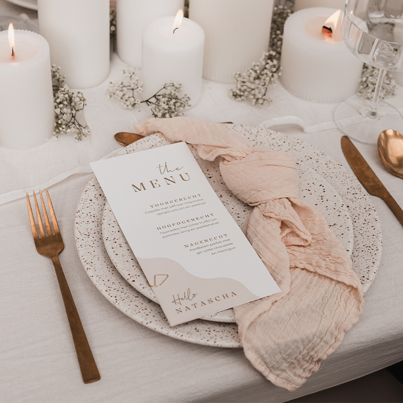 Elegant gouden menukaart voor jullie bruiloft. Pas het ontwerp aan in onze online editor.