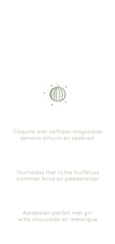 Presenteer jullie gasten het menu in stijl met deze prachtige menukaart in klassiek design met goudfolie en salie groen accenten. Perfect voor een elegante bruiloft. Personaliseer de kaart eenvoudig met jullie menu en creëer een onvergetelijke indruk.