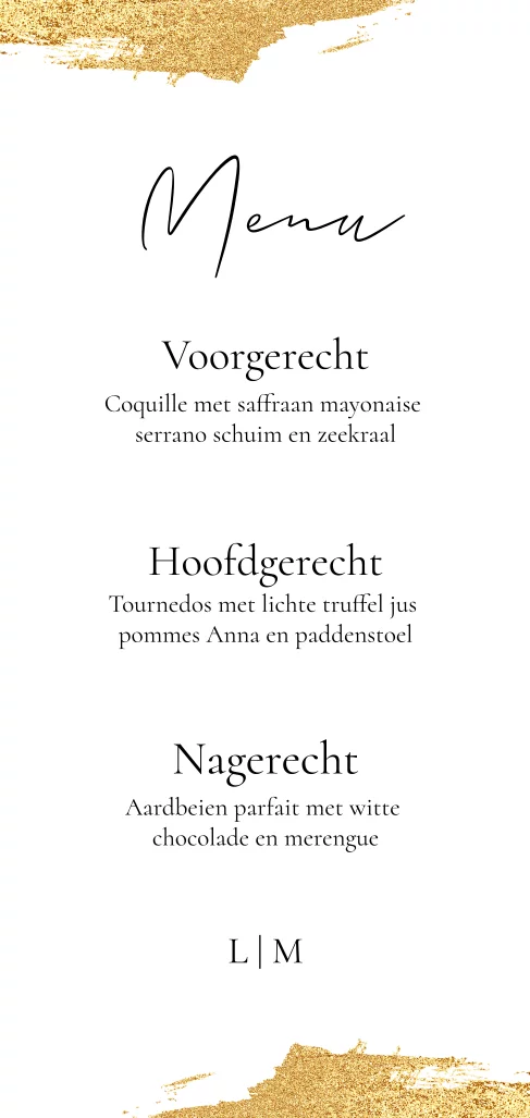 Maak jouw bruiloft compleet met deze elegante menukaart met luxe goudvegen. Bestel de menukaart als onderdeel van de Minimalistische zwart-wit-goud trouwhuisstijl en zorg voor een prachtig samenhangend geheel in één stijl.