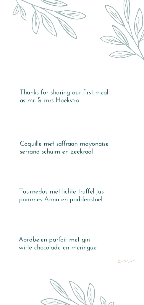 Turquoise Menukaart met takjes en rosegoudfolie. Perfect voor een prachtige tafelstyling voor jullie bruiloft. Ga voor een complete trouwhuisstijl met de bijpassende save the date & trouwkaart.