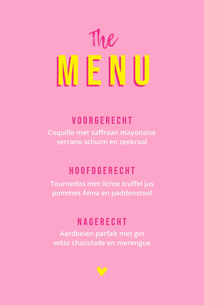 Elk detail klopt aan deze prachtige menukaart. De combinatie van de felle neon kleuren roze en geel zorgt voor een unieke en vrolijke uitstraling. De kaart is niet alleen mooi om naar te kijken, maar ook praktisch en overzichtelijk. Met deze menukaart maak je gegarandeerd indruk op je gasten.