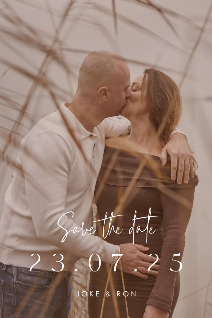 Deze elegante save the date kaart met eigen foto is de perfecte manier om jullie trouwdatum stijlvol aan te kondigen. Het ontwerp combineert tijdloze typografie met ruimte voor een persoonlijke foto, waardoor het kaartje een warme en unieke uitstraling krijgt. Personaliseer eenvoudig jullie namen, datum en tekst in onze gebruiksvriendelijke editor. Zo creëren jullie in een handomdraai een stijlvolle en persoonlijke uitnodiging die perfect past bij jullie grote dag.