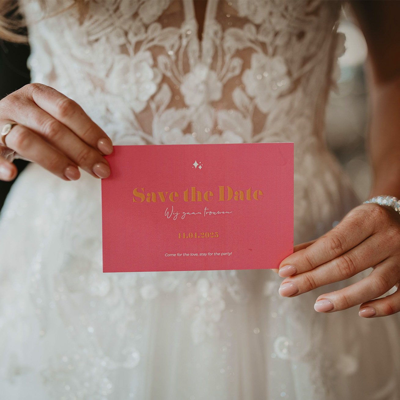 De kaart is volledig te personaliseren in onze gebruiksvriendelijke online editor. Pas eenvoudig de teksten, kleuren en lettertypes aan naar jullie eigen stijl. De sprankelende look past perfect bij een bruiloft met een kleurrijk of feestelijk thema, zoals disco of summer chic