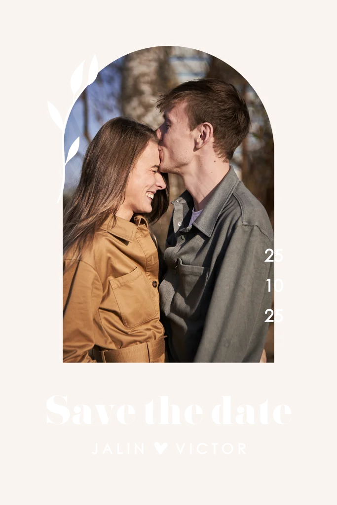 Kondig jullie trouwdatum aan met deze elegante save the date kaart in botanische stijl. Het verfijnde ontwerp met subtiele bladeren en natuurlijke tinten straalt rust en stijl uit. Perfect voor een romantische, klassieke of buitenbruiloft. In onze gebruiksvriendelijke editor pas je de kaart moeiteloos aan met eigen tekst, kleuren en lettertypes. Zo maak je er een persoonlijke en unieke uitnodiging van, helemaal in jullie sfeer.