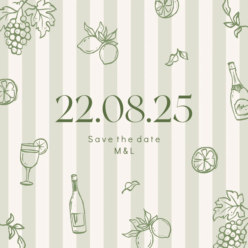 Elegante save the date kaart met groene strepen op de achtergrond en vrolijke getekende illustraties. Leuk voor een een Italiaans thema met limoenen, citroenen en wijn. De kleuren pas je gemakkelijk zelf aan in de handige editor, net als de tekst en het lettertype. Bekijk ook de bijpassende trendy trouwkaart en andere wedding stationery items.