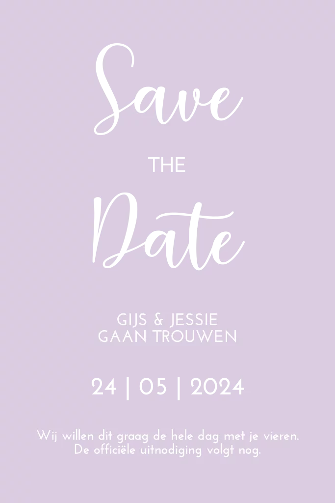 Save the date in zachte lila kleur met de nieuwe trend: holografische foliedruk! De kleuren en het lettertype pas je gemakkelijk zelf aan in de editor.