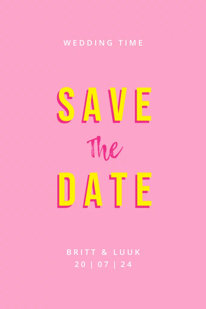Zomerse Save The Date met fel roze & gele kleuren. Malibu beach love vibes. Enthousiast over ontwerp maar liever andere kleuren? Pas het gemakkelijk zelf aan in de online editor. Bekijk ook de bijpassende trouwkaart, welkomstbord, menukaart en naamkaartjes