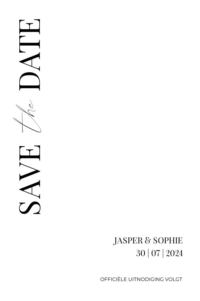 Save the date kaart in een minimalistische zwart wit stijl. De kaart behoort tot een complete trouwhuisstijl-set met o.a. trouwkaart, RSVP kaart, naamkaartjes en menukaarten.