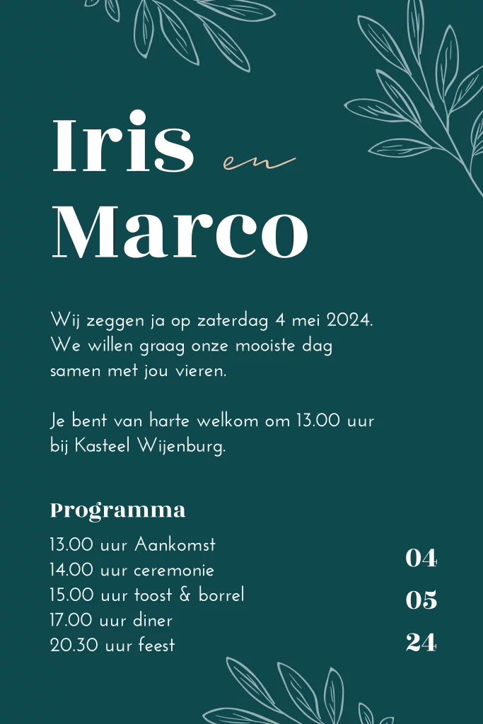 Trouwkaart met een mooie turquoise achtergrond, botanische takjes en rosegoudfolie. De kleuren en het lettertype pas je gemakkelijk zelf aan in de editor. Bekijk ook de bijpassende save the date kaart voor alles in 1 stijl.