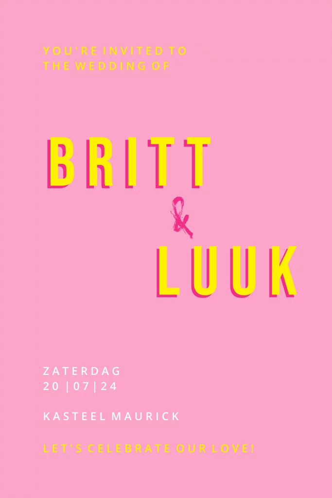 Verstuur een opvallende en vrolijke trouwkaart met deze zomerse kaart in fel roze en gele kleuren. Liever wat rustigere tinten of een elegante goudfolie? Pas eenvoudig zelf de kleuren, teksten en het programma aan in de handige editor voor een persoonlijke touch.